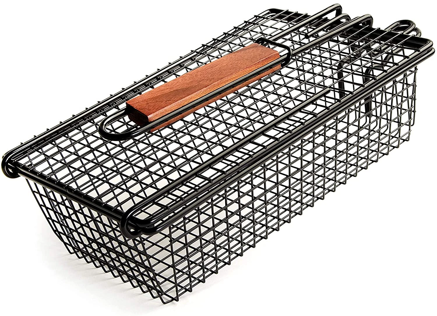 Non-Stick Shaker Basket with Lid & Folding Handle is perfect for shrimp, peppers, onions, chunks of vegetables and boneless chunks of poultry, beef, or other meat that would otherwise fall through the grill. Handle folds for easy storage.