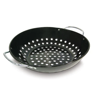 11 in. diameter x 2.5 in. deep, porcelain coated wok with stainless steel handles and perforations. Rolled edge for rigidity and safety.
