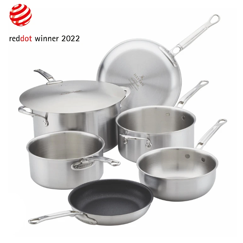 The triple-bonded 18/10 stainless-steel construction featuring Hestan’s exclusive ProCore™ aluminum delivers 35% greater heat conductivity. That means faster, more consistent heating, plus faster recovery time to stay in control of temperature and timing. In addition, you’ll find that the sauté pans, sauce pots, rondeau, saucier, and stock pot are wider, not taller, to increase cooking surface for better heating, browning, and enhanced flavor. The set also contains an 8.5-inch sauté pan that is finished with TITUM™ nonstick, multi-layer system – the world’s most durable nonstick. Completing this assortment of pots and pans, is the 12.5″ universal lid with Hestan steam vents to reduce boil overs, pressure, and eliminate rattling. Durable, innovative sealed rims make this thoughtfully crafted cookware set 100% dishwasher safe, while purposeful engineering accommodates a wide range of culinary needs including oven and broil safe to 600°F*.