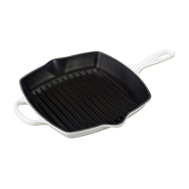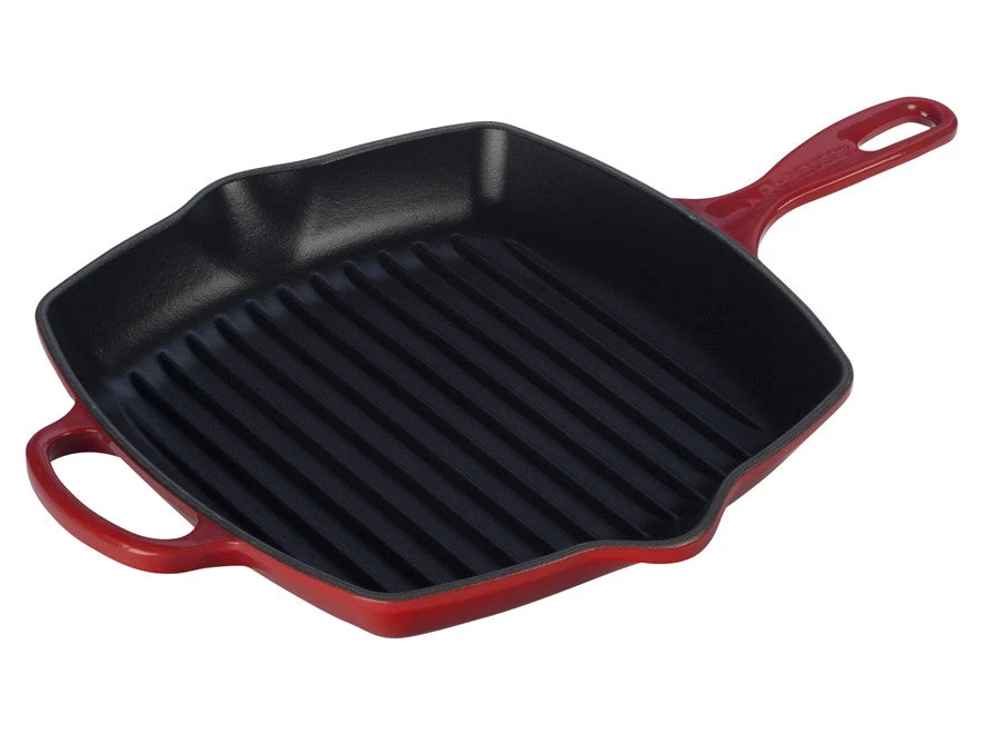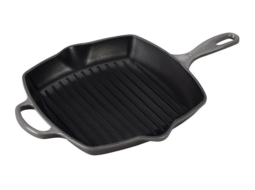 The Square Skillet Grill’s interior is coated with Le Creuset’s protective satin black finish to prevent damage and wear. Over time, this slightly abrasive interior develops a natural patina that is ideal for searing and frying.