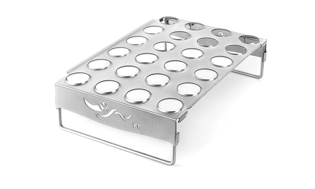 This hot number will help you roast poppers and chicken legs right, with a flared hole design to prevent juices from dripping onto flames and causing flare-ups. The stainless steel construction is safe for the dishwasher and has collapsible legs to make storage easier
