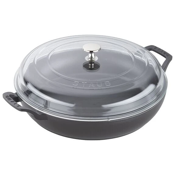 The STAUB 3.5-quart braiser with glass lid is the perfect cookware for one-pot dinners, slow-cooked braises, and simmered soups. The heavyweight, domed glass lid locks in moisture and accommodates large cuts of meat. STAUB cast iron possesses exceptional heat-retention qualities, so the pot heats evenly throughout. The textured black matte enamel interior ensures exceptional browning and requires no seasoning. Rooted in French culinary heritage, STAUB cookware is beloved by professional and home chefs for its exquisite craftsmanship, exceptional performance, and timeless beauty. Each STAUB cocotte effortlessly and elegantly transitions from the oven to the table – you can cook and serve in the same dish. Built to last a lifetime, these heirloom pieces are designed to be passed from generation to generation.
